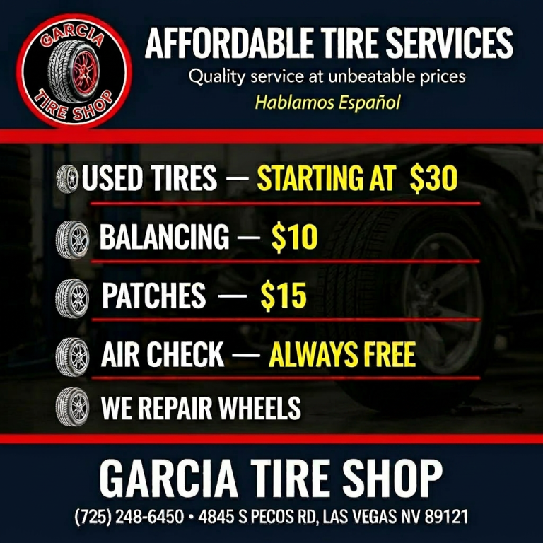 At Garcia Tire Shop, we provide competitive pricing on top-quality tires and auto repair services. Our expert technicians ensure your vehicle runs smoothly and safely. Serving Las Vegas drivers with trust and care since day one.